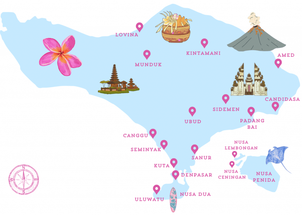 Antes de explicaros el itinerario creo que es importante hacerse una idea de las diferentes zonas de Bali que hay para visitar y así poder decidir donde quieres pasar más tiempo. Por eso os he hecho este mapa donde aparecen todas las zonas principales turísticas.