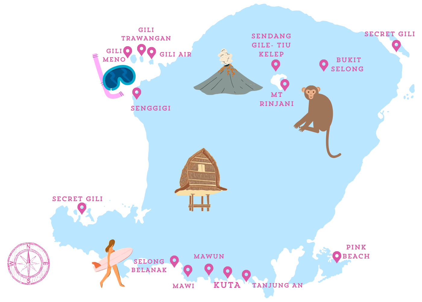 Para conocer la isla puedes decidir hacer una ruta por la misma o centrarte en la parte norte o sur. La parte del norte acoge el Monte Rinjani, un volcán activo en el que puedes ascender en tours de uno o varios días. Además, tienes zonas de cascadas, miradores naturales y unas preciosas playas que recorren toda la costa de Senggigi. De camino al sur podrás encontrar algún poblado Sasak, poblados tradicionales de la isla, además de otras zonas rurales donde fabrican artesanías. Por otro lado, la zona del sur acoge unas playas de arena blanca y aguas turquesa que cuentan un sinfín de escuelas de surf. El pueblo donde la gente suele hacer base se llama Kuta, tiene un ambiente muy animado y dispone bastante infraestructura hotelera y gastronómica. Podrás encontrar bastantes islas que salpican toda la costa del sur, también llamadas Gili aunque menos conocidas, y podrás explorarlas en tours de un día.